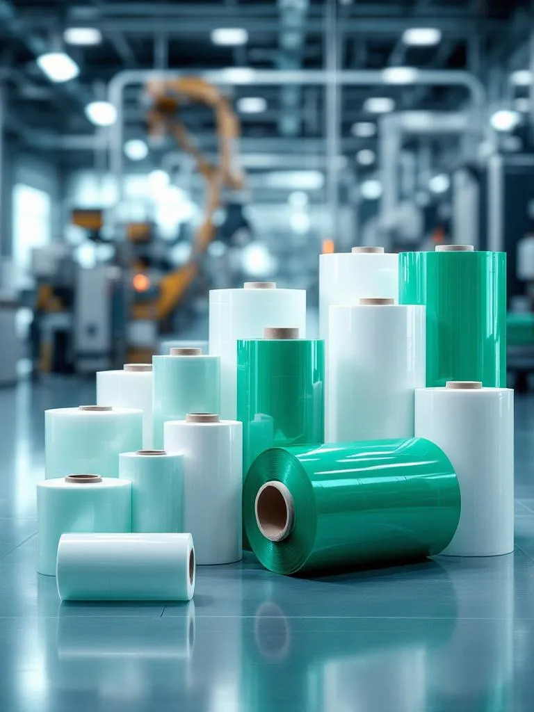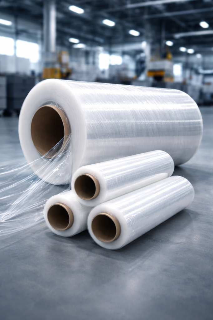 Película plástica estirable de alta resistencia utilizada para envolver y asegurar mercancías en pallets, brindando protección y estabilidad durante el almacenamiento y transporte.